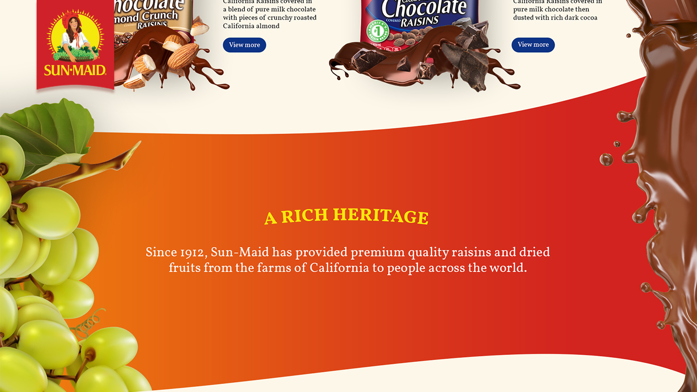 Sun-Maid Chocolate Raisins wanted a modern, mobile-optimized site that more clearly communicated “the magic of chocolate” while staying connected to the original Sun-Maid brand. The new site needed to act as a launchpad for the brand’s expanded product portfolio—featuring three new flavors including Chocolate ‘N Peanut Butter, Cocoa Dusted and Almond Crunch. It was important to showcase the brand’s new packaging and size options while providing an easy way to find ingredients, nutritional facts and more.